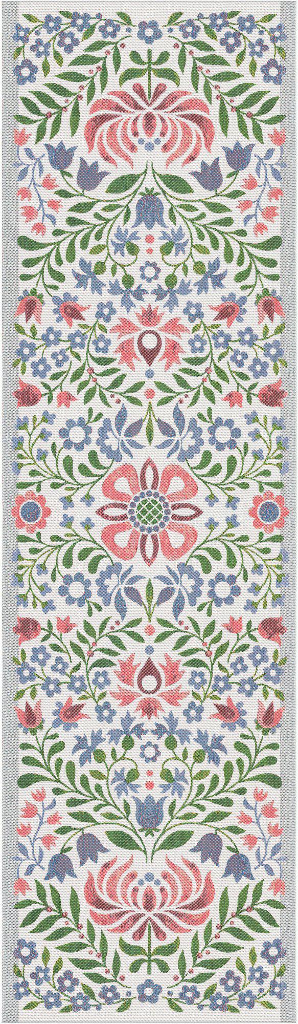 Bordslöparen Akvarell i storleken 35×120 cm är en dekorativ bordstextil som passar bra på mindre matbord, sideboard eller andra smalare ytor. Det avlånga formatet ger ett mjukt och harmoniskt uttryck som ramar in dukningen på ett stilrent sätt.