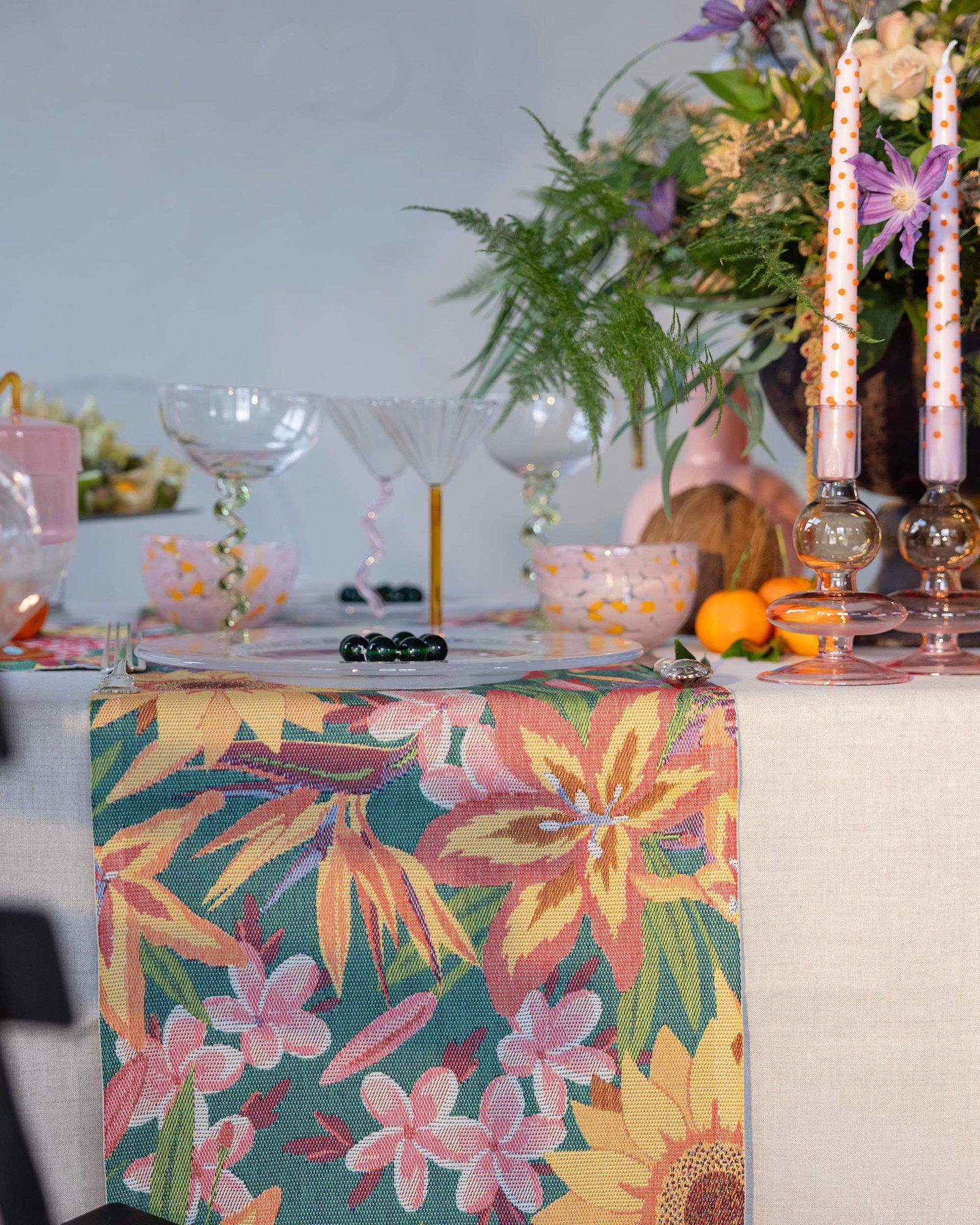 Bordslöparen Flores i storleken 35×120 cm är en dekorativ bordstextil som passar bra på mindre matbord, sideboard eller andra smalare ytor. Det avlånga formatet ger ett balanserat och harmoniskt uttryck som ramar in dukningen på ett genomtänkt sätt.