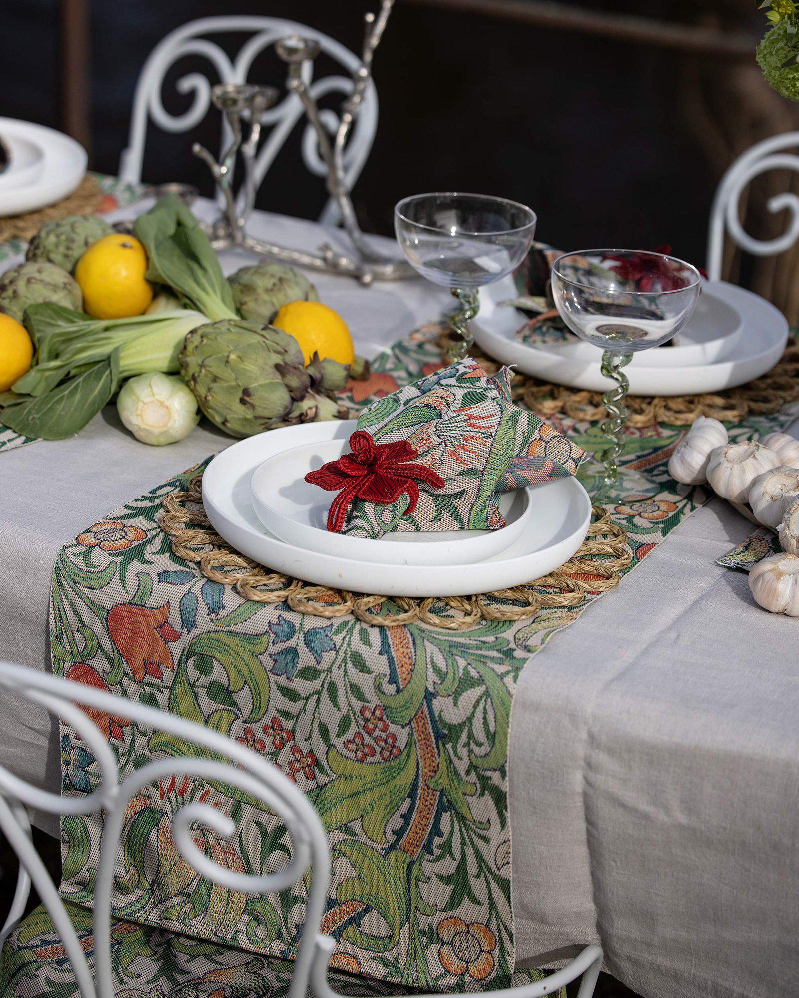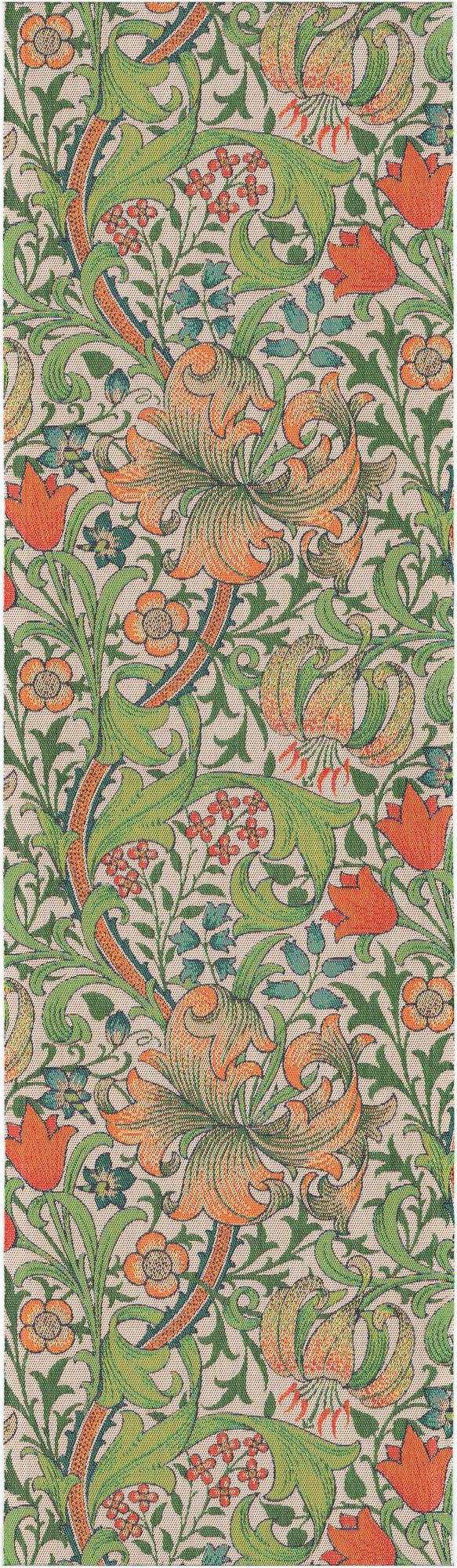 Bordslöparen Golden Lily WM i storleken 35×120 cm är en dekorativ bordstextil som passar bra på mindre matbord, sideboard eller andra smalare ytor. Det klassiska mönstret ger ett elegant och genomarbetat uttryck som ramar in dukningen på ett harmoniskt sätt.