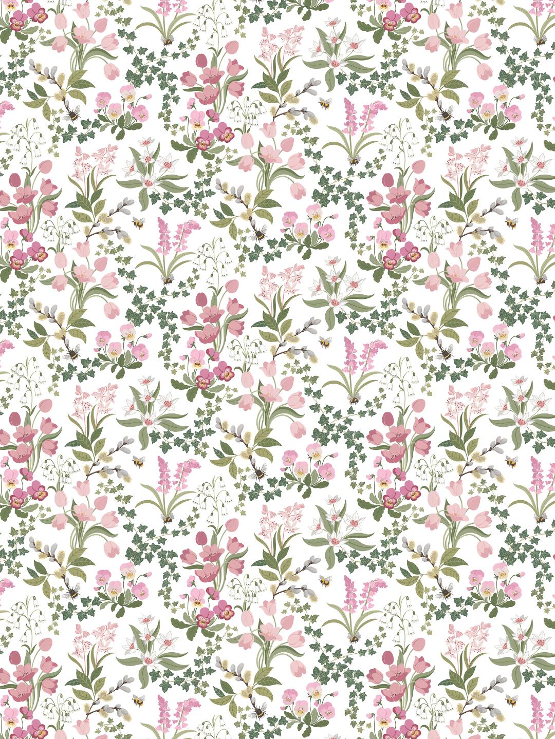 Humlegården rosa/grön är ett handritat mönster som fångar känslan av vårens första solstrålar och humlans surr. Videung, snödroppe och tulpan binds samman av murgröna i ett följsamt och harmoniskt uttryck. Bredd är 150 cm.