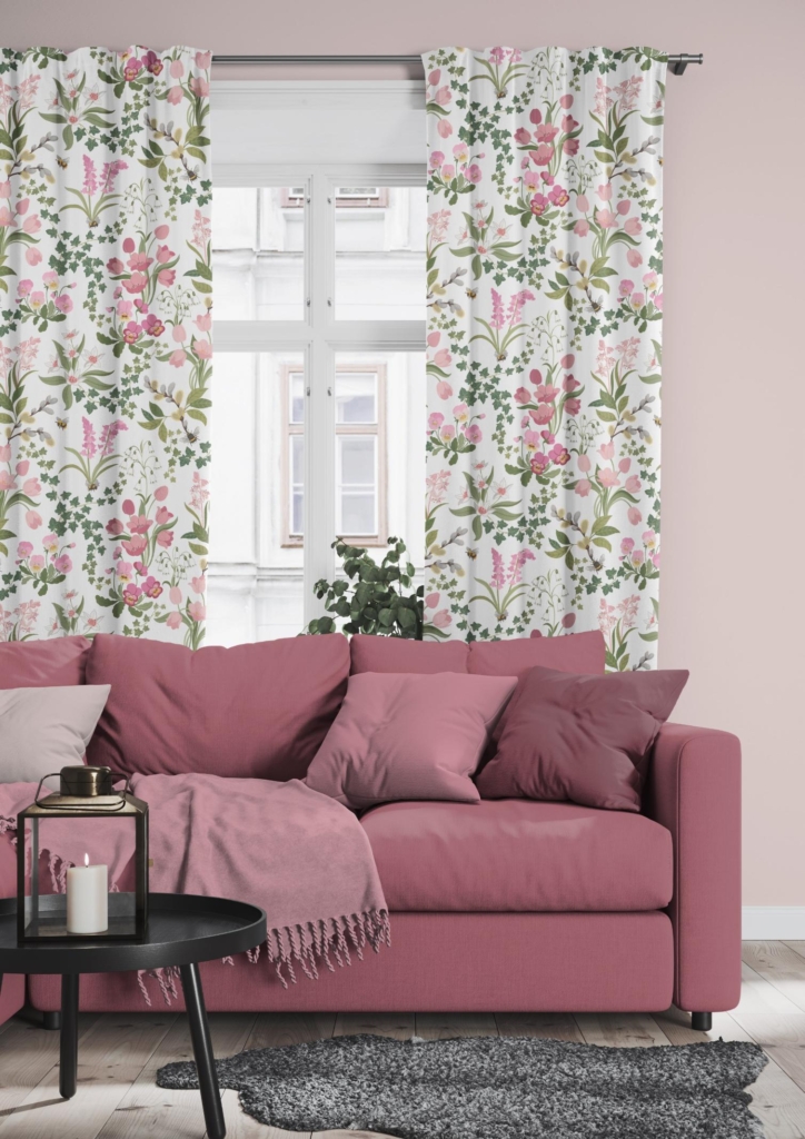 Humlegården rosa/grön är ett tyg som låter naturens skönhet ta plats och ger rummet ett mjukt och harmoniskt uttryck året runt.